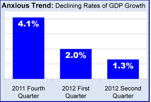 Little noticed by the establishment media, the Commerce Department revised it’s estimate of second quarter economic growth downward from 1.7% to 1.3%. The trend suggests an economy deteriorating toward, rather than growing away from, recession.