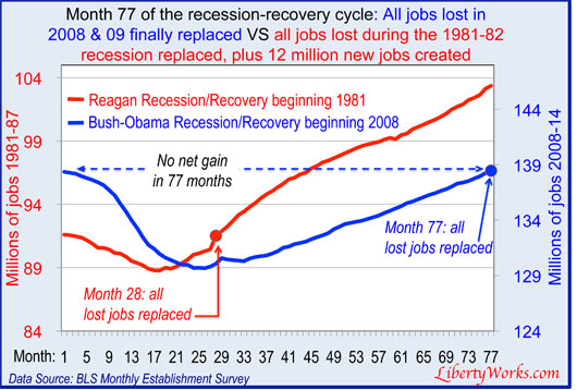 The Labor Department’s monthly jobs report marked a long awaited milestone that, had it occurred in 2010 would have been cause for jubilation. But in 2014 it’s a grim reminder of continuing economic misery in year five of the most anemic economic recovery in seven decades.