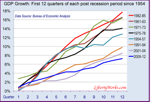 Economic growth as measured by Gross Domestic Product has been a deep disappointment under the Obama borrow-spend-regulate approach.  There is no reason to believe that massive deficits, constantly threatening major tax increases, government take-over of health care and subsidies to blue-sky energy schemes will ever result in a return to growth and prosperity.  As Candidate Obama said in 2008, it’s time for a change.