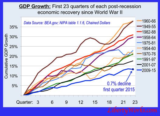 On Friday the Commerce Department issued a sharply downward revision of its GDP report for the first quarter of 2015. Instead of growing at a miniscule 0.2% the economy contracted. GDP came down 0.7%.
