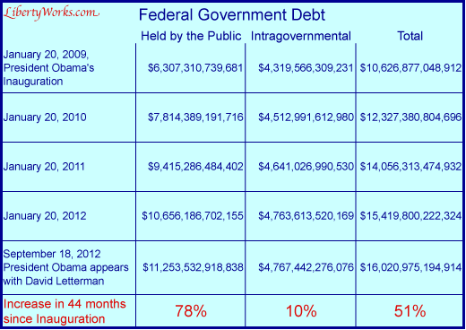 Letterman simply accepted, without apparent surprise, Obama’s preposterous claim that he couldn’t remember how much the debt was. Readers are urged to call the Obama campaign and leave a message for the President. Let him know the figures are available here at LibertyWorks.com