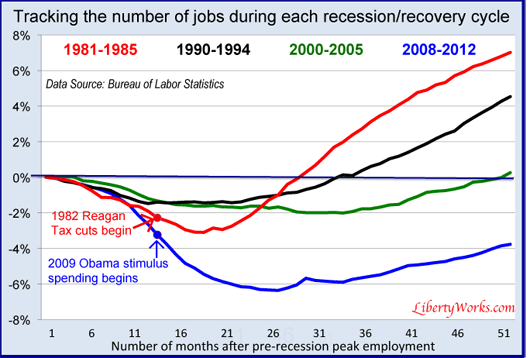 Keynesians simply ignore the experience of previous recessions when, without massive government intervention, the private sector recovered and jobs were created much more rapidly.