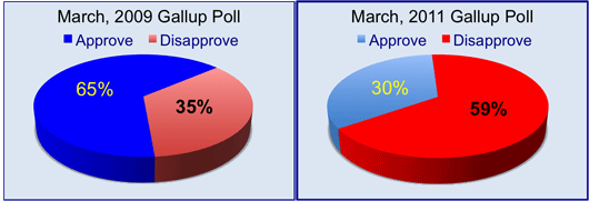 The March, 2011 Gallup poll came after America learned, by living through two years of grim reality, that the advocates of big government, deficit spending were incompetent or were hustlers or were both.