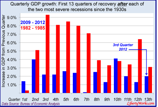 The Commerce Department has released it’s quarterly report. Gross Domestic Product (GDP) was up 2% during the third quarter, 2012. While the Obama campaign tries to spin this as happy news, it’s way below average and tens of millions of Americans feel acute pain in an anemic economy. [continued below the chart]